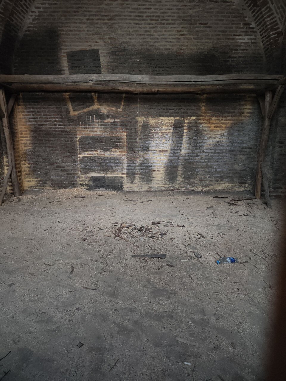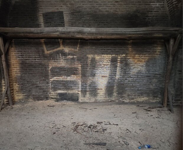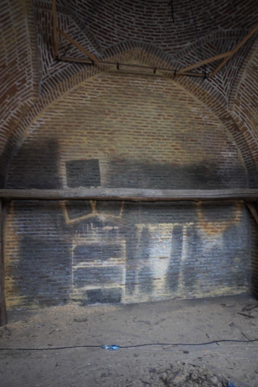 در بخشی از دیوار آجری ، یکی از شبهای شمال شرقی مسجد قدیمی ، رنگ تیره پاشیده می شود و رد مراحل روشن است. این بخش که ظاهراً در سری Narges Abyar برای بازسازی مکان “بازار” استفاده می شود ، اکنون بدون پاکسازی حرفه ای رها شده است!